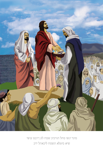ישוע ביקש את הדגים והלחם ופטרוס שם אותם בסל והביא לו אותם. פטרוס היה גבוה יותר מישוע, עם מבנה גוף גדול יותר. ישוע שם את שתי ידיו על הסל וברך.
