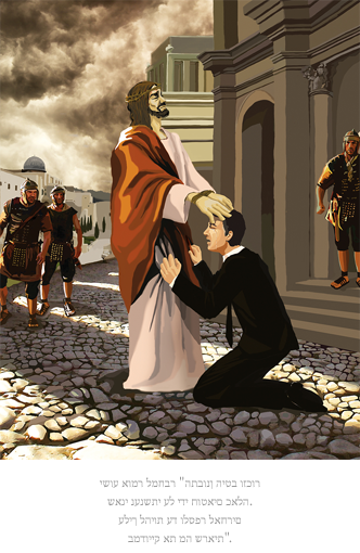 כאשר ישוע עזב את חצרו של פונטיוס פילאטוס, בדרכו לצלב, אנשים הצביעו עליו באצבע וצחקו עליו. בחזיוני, צפיתי בו סובל. המום מצער וחסר תקווה, רצתי לישוע ובכיתי כשאני נאחז בבגדיו. כרעתי ברך לפניו ושאלתי, "מדוע אתה לא עושה דבר למרות סבלך הרב?" אז שם ישוע את ידיו הכבולות על ראשי ואמר, "התבונן היטב וזכור שאני נענשתי על ידי חוטאים כאלה. עליך להיות עד ולספר לאחרים בדיוק מה שראית". כאשר התעוררתי מהחיזון, לבי היה שבור ובכיתי.