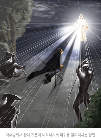 마귀가, “보라. 우리가 죽인 예수다. 그래도 예수를 따르겠느냐?”고 하기에 나는 아무런 대답을 하지 않았다. 마귀가 재차, “네가 예수를 버리면 무엇이든지 해주겠다. 너는 예수가 대단한 줄 알지만, 우리 능력이 더 크다. 우리의 능력을 보라.”고 하였다. 저만치 목에 머플러를 두른 어떤 여자가 지나가는데, “노랗게 되라.”고 하니까 즉시 머플러가 노란색으로 변하고, “빨갛게 되라.”고 하니 또 즉시 빨갛게 변하였다.