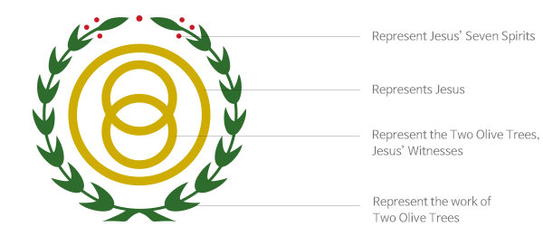 Two olive tree branches outside of the circle represent the work of Two Olive Trees. Seven dots at the top symbolize Jesus’ seven eyes, which are the seven spirits of God, and signify that the Holy Spirits are with the work of the Olive Tree. (Zechariah 4:10, Revelation 5:6)